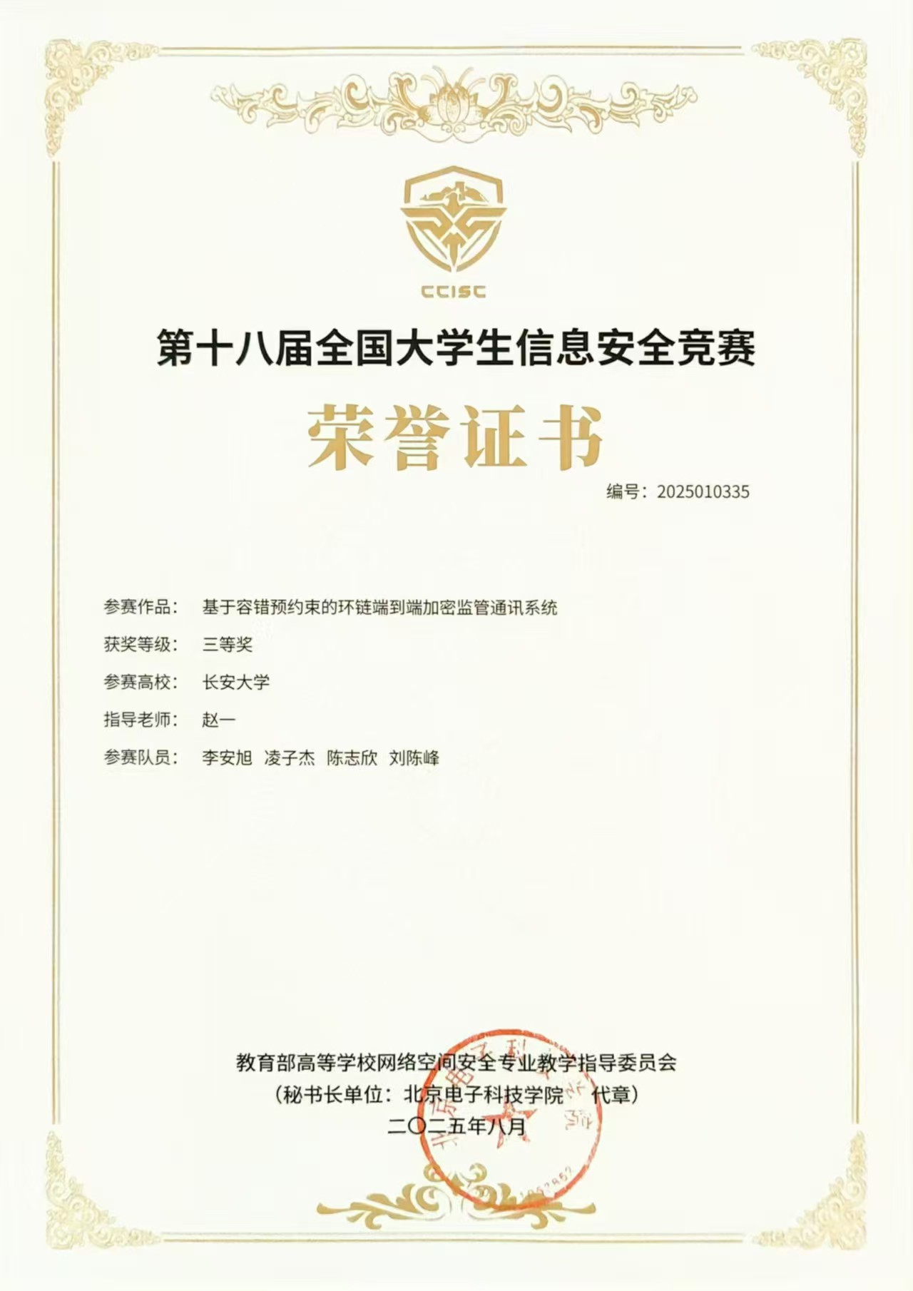 2025年8月14日,第十八届全国大学生信息安全竞赛作品赛决赛在西安交通大学兴庆校区举办,太阳集团tcy8722网站李安旭、凌子杰、陈志欣、刘陈峰四位本科生同学组成的长大网安小队,由赵一老师指导的作品—《基于容错预...