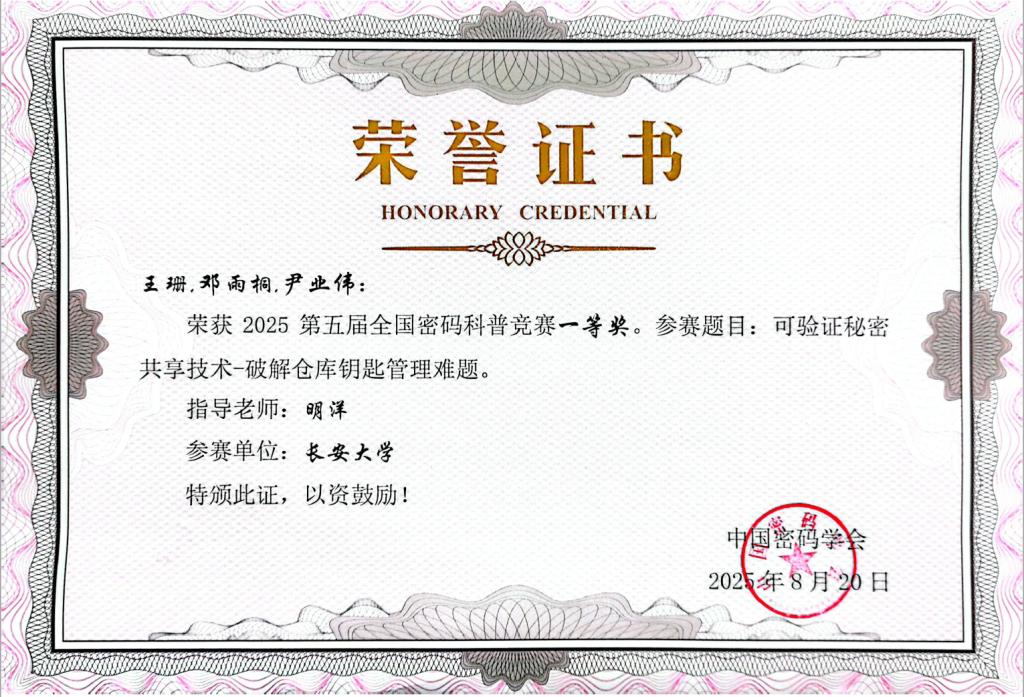 2025年8月14日,第五届全国密码科普竞赛决赛在河南新乡圆满落幕。由我们明洋教授指导,研究生王珊、邓雨桐、尹业伟共同制作的密码技术科普视频《可验证秘密共享技术—破解仓库钥匙管理难题》荣获本次竞赛一等奖。 本...