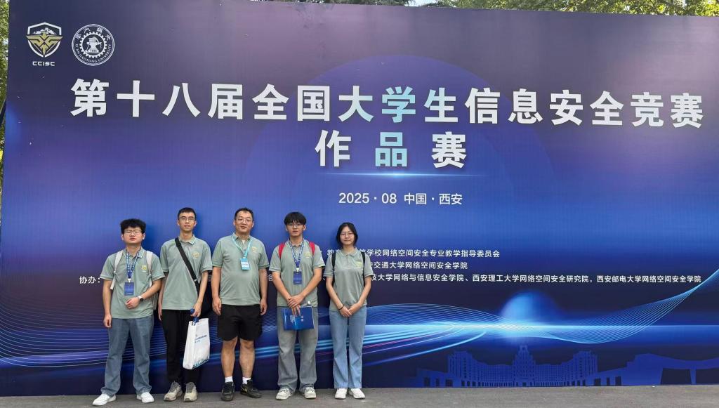 2025年8月14日,第十八届全国大学生信息安全竞赛作品赛决赛在西安交通大学兴庆校区举办,太阳集团tcy8722网站李安旭、凌子杰、陈志欣、刘陈峰四位本科生同学组成的长大网安小队,由赵一老师指导的作品—《基于容错预约束的环链端到端加密监管通讯系统》荣获三等奖。这是我校首次获得该比赛奖项,实现了学校在该赛事奖项上“零的突破”!