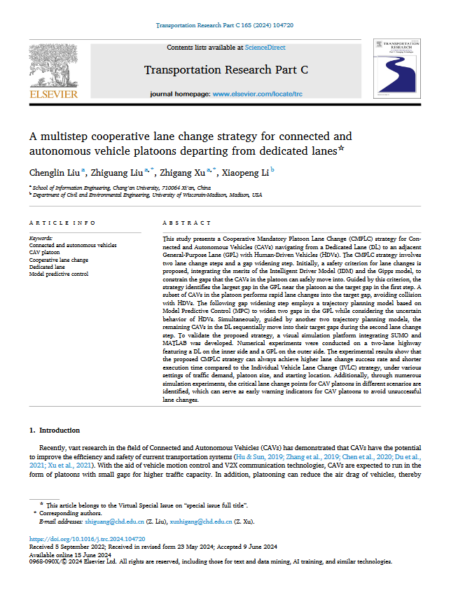 近日,我们博士生刘成林在导师徐志刚教授的指导下,以第一作者身份在交通运输工程学科国际顶级期刊《Transportation Research Part C : Emerging Technologies》(TR-C)上发表论文“A multistep cooperative lane change strategy for connected and autonomous vehicle platoons departing from dedicated lanes”(自动驾驶专用车道车辆队列多步协同换道策略)。论文通信作者为徐志刚教授和刘志广讲师,论文第一署名单位和通信作者单位均为大阳城集团网站8722。