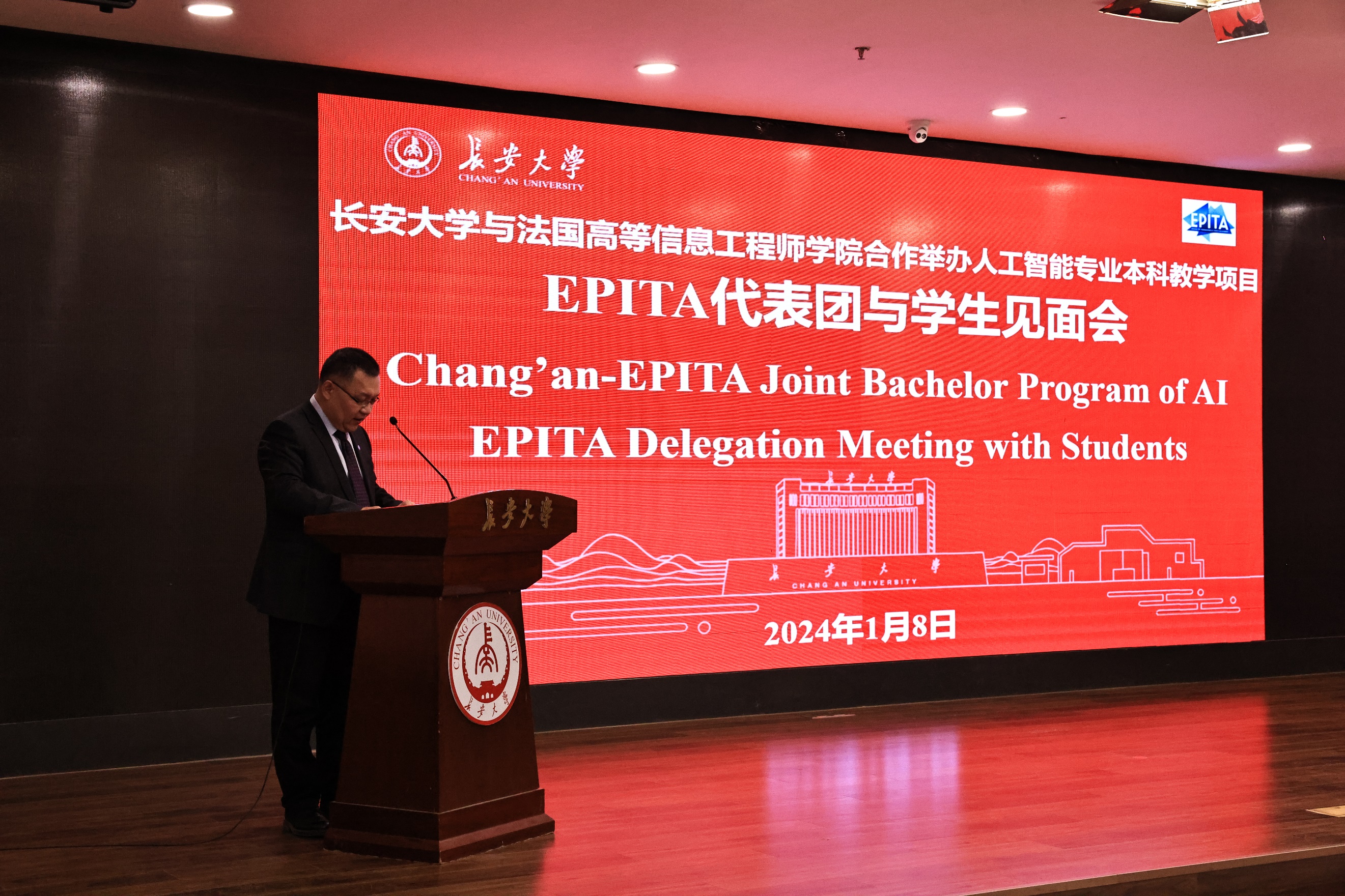 2024年1月8日下午,太阳集团tcy8722网站在大学生活动中心三楼多功能活动厅举行法国高等信息工程师学院(EPITA)代表团与学生见面会。EPITA副校长Claire Lecocq、国际处主任Stéphanie Chatelet、亚洲事务负责人Cédric Barrier、中国事务负责人Jane Geng、太阳集团tcy8722网站党委书记胡予欣、院长安毅生、副书记陈沛、副院长明洋、人工智能系负责人及教师代表、中法合作办学全体学生参加会议。会议由安毅生主持。