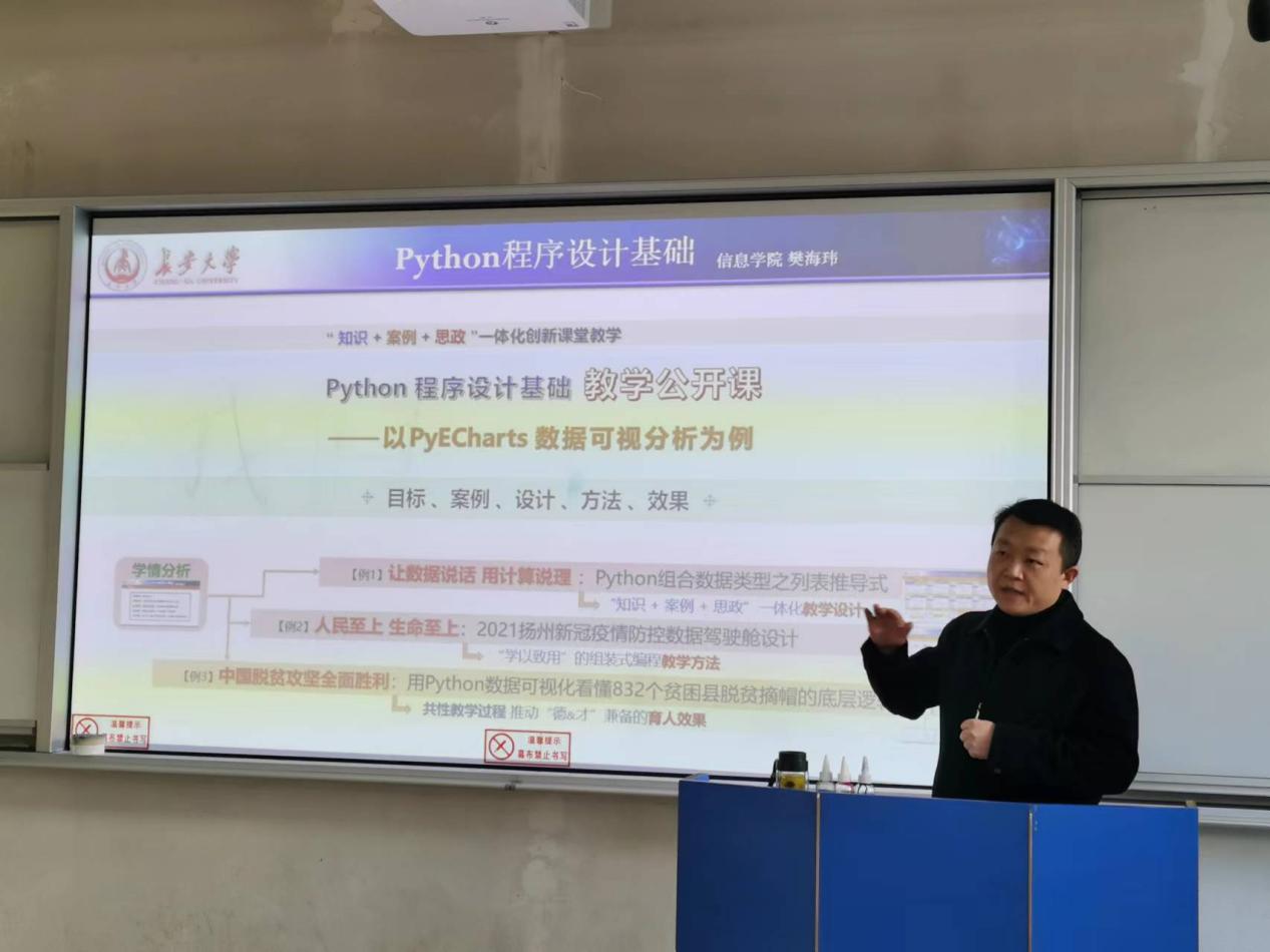 公开课上,演示了三个教学案例:“用数据说话,用计算说理:Python组合数据类型之列表推导式”、“人民至上,生命至上:2021扬州新冠疫情防控数据驾驶舱设计”、“中国脱贫攻坚全面胜利:用Python数据可视化看懂832个贫困县脱贫摘帽的底层逻辑”。案例生动运用“严谨求实的科研精神”、“程序审美观”、“唯有国家强盛,方得人民富裕幸福”等思政元素,解读“中国共产党为什么能,中国特色社会主义为什么好,归根到底是因为马克思主义行!”,使学生深刻领悟“两个确立”,坚决做到“两个维护”。