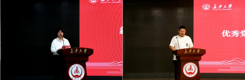 2021级本科生徐悦、2021级硕士研究生李子琦分别作为新发展党员代表、优秀党员代表进行发言,表示将用实干践行使命、用奉献诠释忠诚,以实际行动为党旗增光添彩。