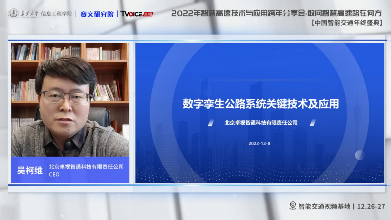 北京卓视智通科技有限责任公司CEO吴柯维分享了《数字孪生公路关键技术及应用》主题演讲,吴柯维认为,当信息管理的数量和种类都达到了一个前所未有的规模,量变触发质变的时候,数字孪生将成为信息化建设的最优解。