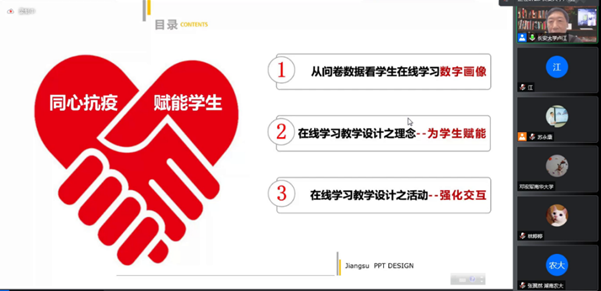 在疫情期间,广大教工响应学院党委号召,积极参与到抗疫行动中。太阳集团tcy8722网站基础教学部卢江老师为提升学生线上学习能力和学习效果,2022年1月20晚19点举办了“同心抗疫、赋能学生”的抗疫特别专题公益讲座。邀请了上海交大”好大学在线“运行主管、混合式教学创新联盟创始人苏永康老师,贵州理工学院全国优秀教师、省级教学名师陈燕秀老师、上海师范大学周单卿老师、湖南农业大学教育学院张翼然老师等四位具有丰富在线教学经验的一线教师。