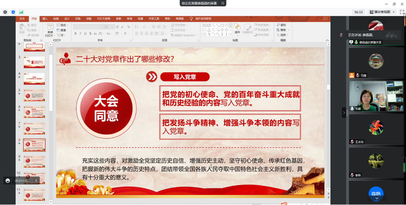 基础教学部党支部宣传委员薛晶晶组织学习了《中国共产党章程(修正案)》,解读了党的二十大修改党章的重大意义及主要特点,重点学习了二十大写入党章的新内容。