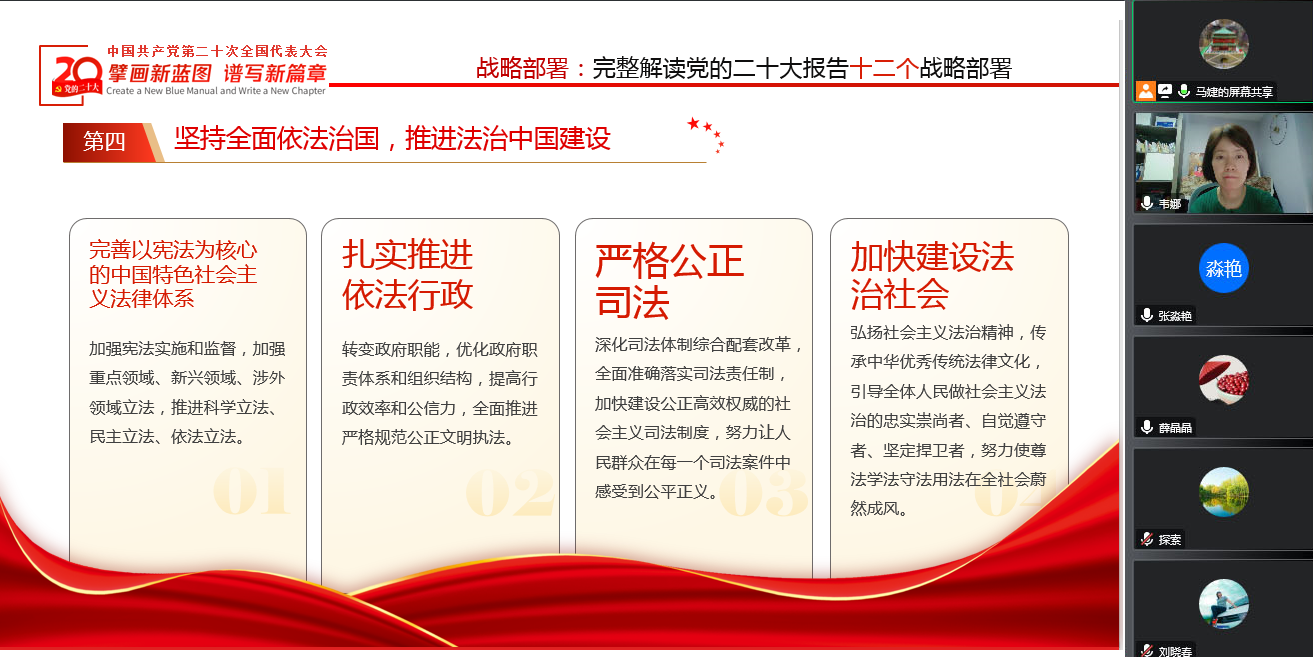 基础教学部党支部组织委员马婕带领大家学习了党的二十大报告第七部分原文内容“坚持全面依法治国,推进法治中国建设”。党的二十大报告对坚持以习近平法治思想为指引,深入推进法治中国建设做出重大决策部署,为新时代推进全面依法治国、建设社会主义法治国家指明了前进方向。