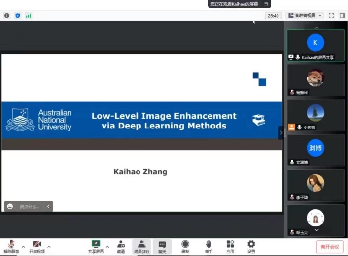 为了拓宽研究生在图像处理方向的知识面和提升学术论文的撰写能力,加强学术交流,克服疫情对研究生培养带来的影响,2022年10月31日,澳大利亚国立大学Zhang Kaihao博士应邀对基于深度学习的图像增强技术做学术报告,学术报告由电子信息工程系主任高涛教授主持。