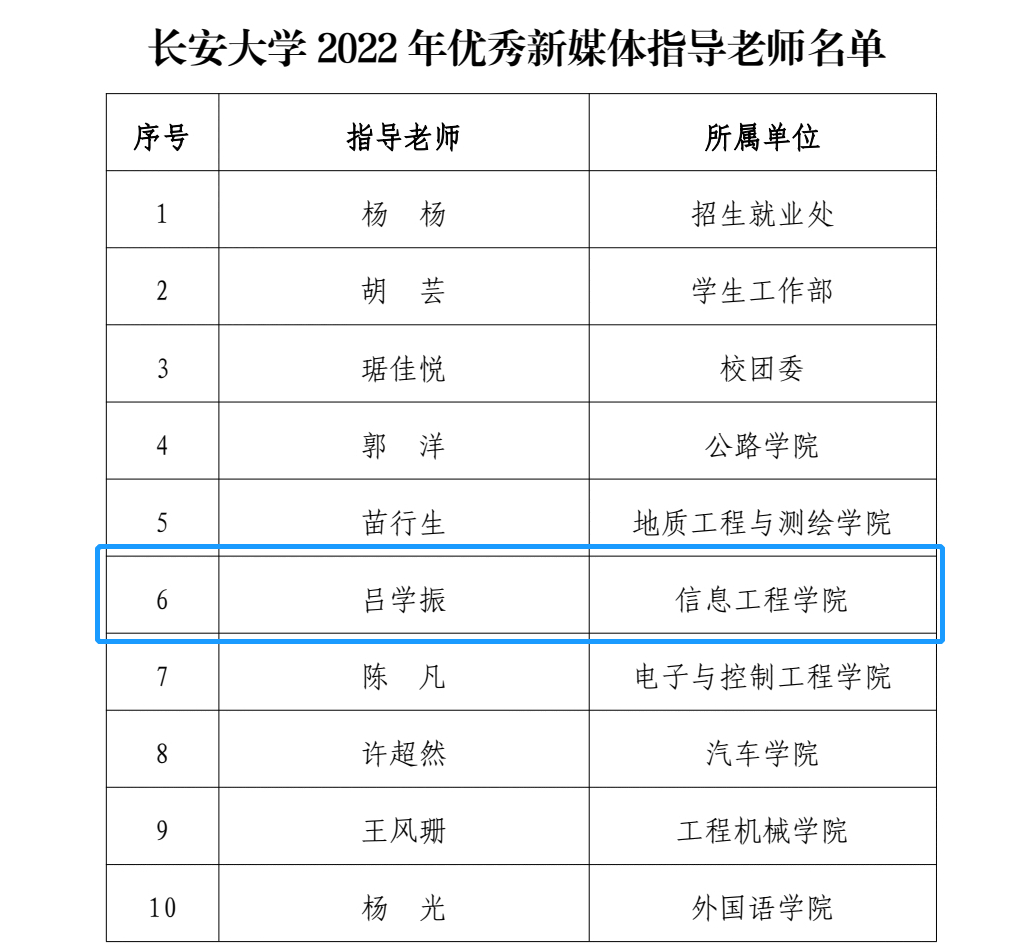 日前,学校揭晓大阳城集团网站87222022年优秀新媒体平台及优秀新媒体指导教师评选结果,经院系申报、专家评分、指标综合评选等环节,“CHD信达天下”微信公众号荣获“大阳城集团网站87222022年新媒体十佳奖”,“CHD信达天下”微信视频号荣获“大阳城集团网站87222022年新媒体单项奖(优秀短视频平台创新奖)”,学院辅导员吕学振荣获“优秀新媒体指导老师”称号。