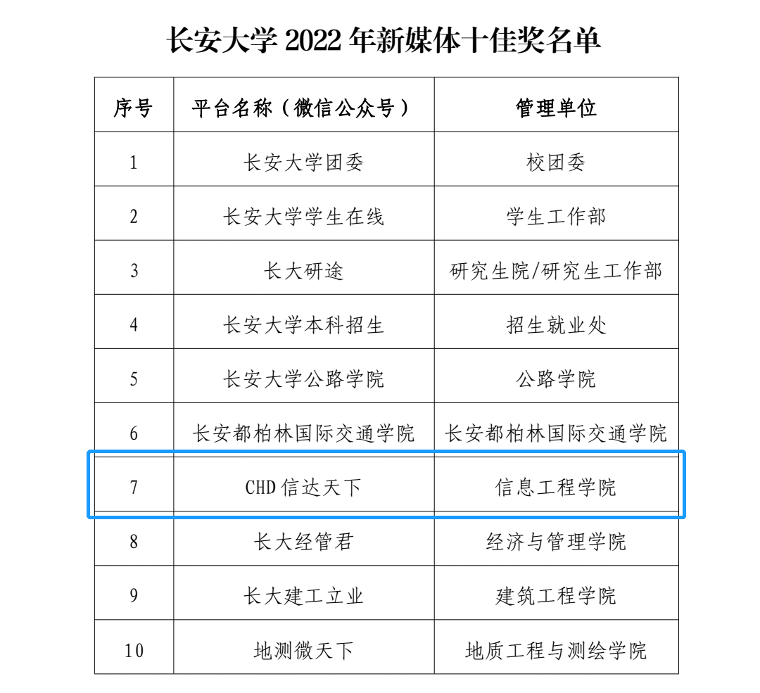 微信公众平台“CHD信达天下”在思想建设与新闻宣传方面已经形成了“工作机制井然高效、要闻大事及时呈现、内容覆盖全面多样、平台建设积极创新、服务育人稳步提升”的发展思路。2022年发布推送400余篇,阅读量累计22万次,现有总用户数7000余人。